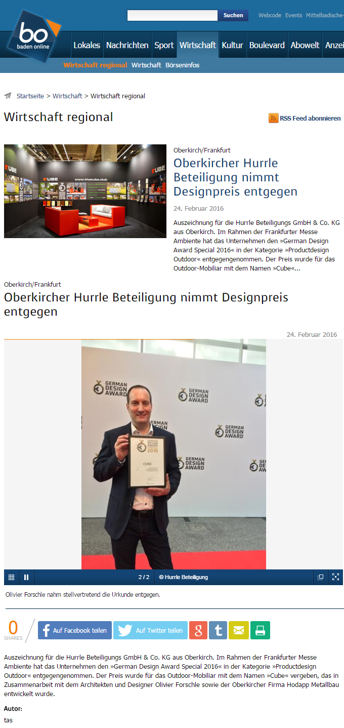 German Design Award 2016 für den Cube >> Artikel lesen ...